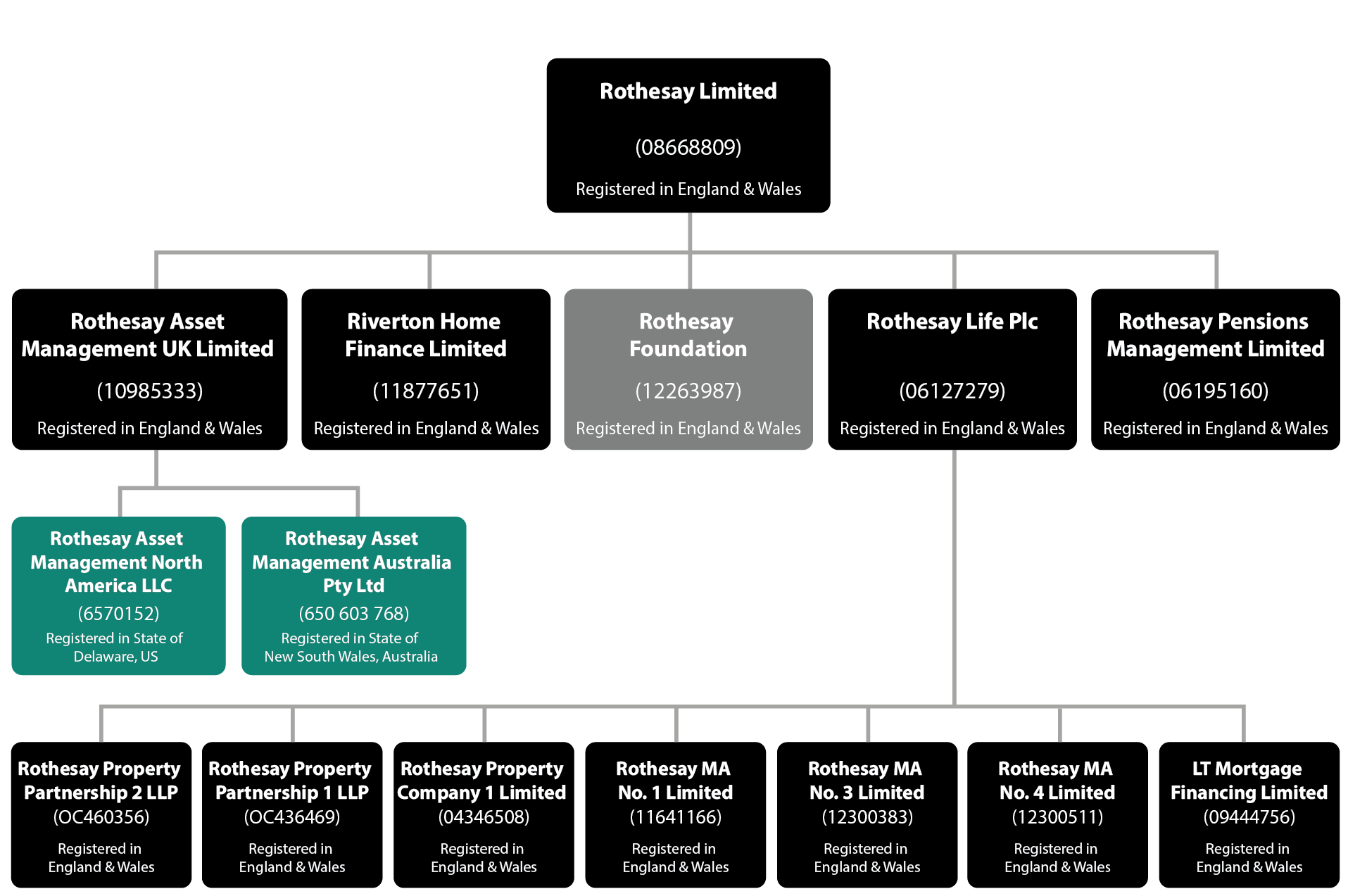 - Each entity is wholly owned by its parent with the exception of Rothesay Property Partnership 1 LLP and Rothesay Property Partnership 2 LLP, each of whose members are Rothesay Life Plc and Rothesay MA No.4 Limited